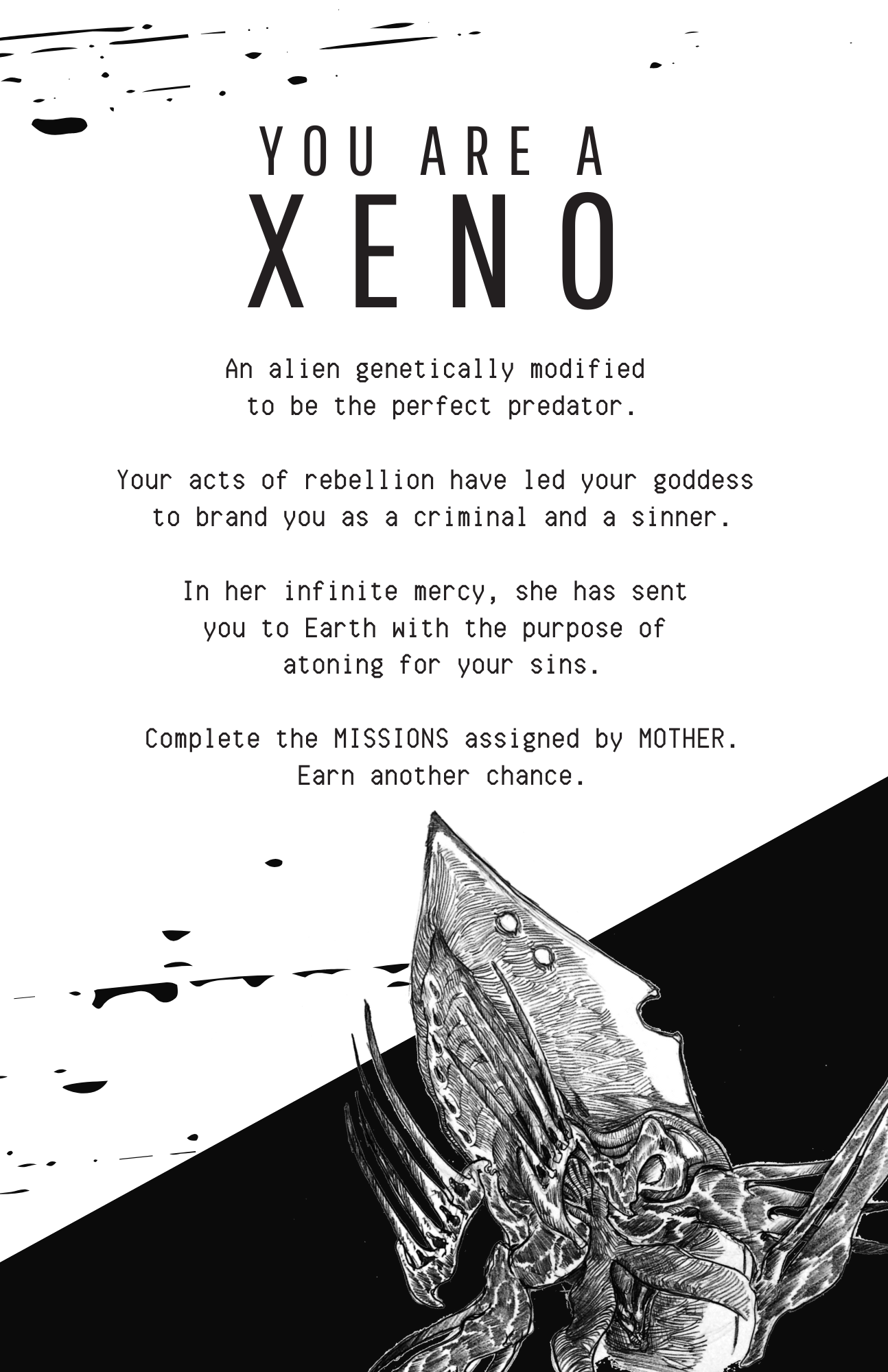 You were born with purpose, glorious and terrible. Your body is bladed, your limbs segmented, and your teeth so terribly sharp. Those that stand between you and your purpose are so much more fragile, though they play at the opposite with crude tools and weapons. You will teach them how fragile their nature, and how foolish it was to obstruct so exquisite a predator as you. A reverse-horror TTRPG, XENO Invasion is a game focused upon providing your table the opportunity to revel in the delights of playing something gribbly and terrible, and deeply inhuman.